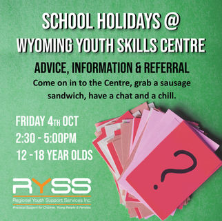 RYSS Wyoming provides youth programs, information and acts as a referral service, networking with Central Coast services to provide the community with updated and ongoing projects, information and assistance for young people aged 12 to 18.